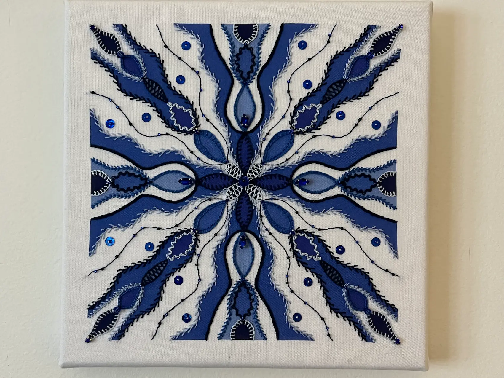 Kit : vous avez donc la toile et le schéma les quantités de fils nécessaires en SAJOU et fil brillant, rocailles, paillettes, cristaux et strass à coudre en cristal