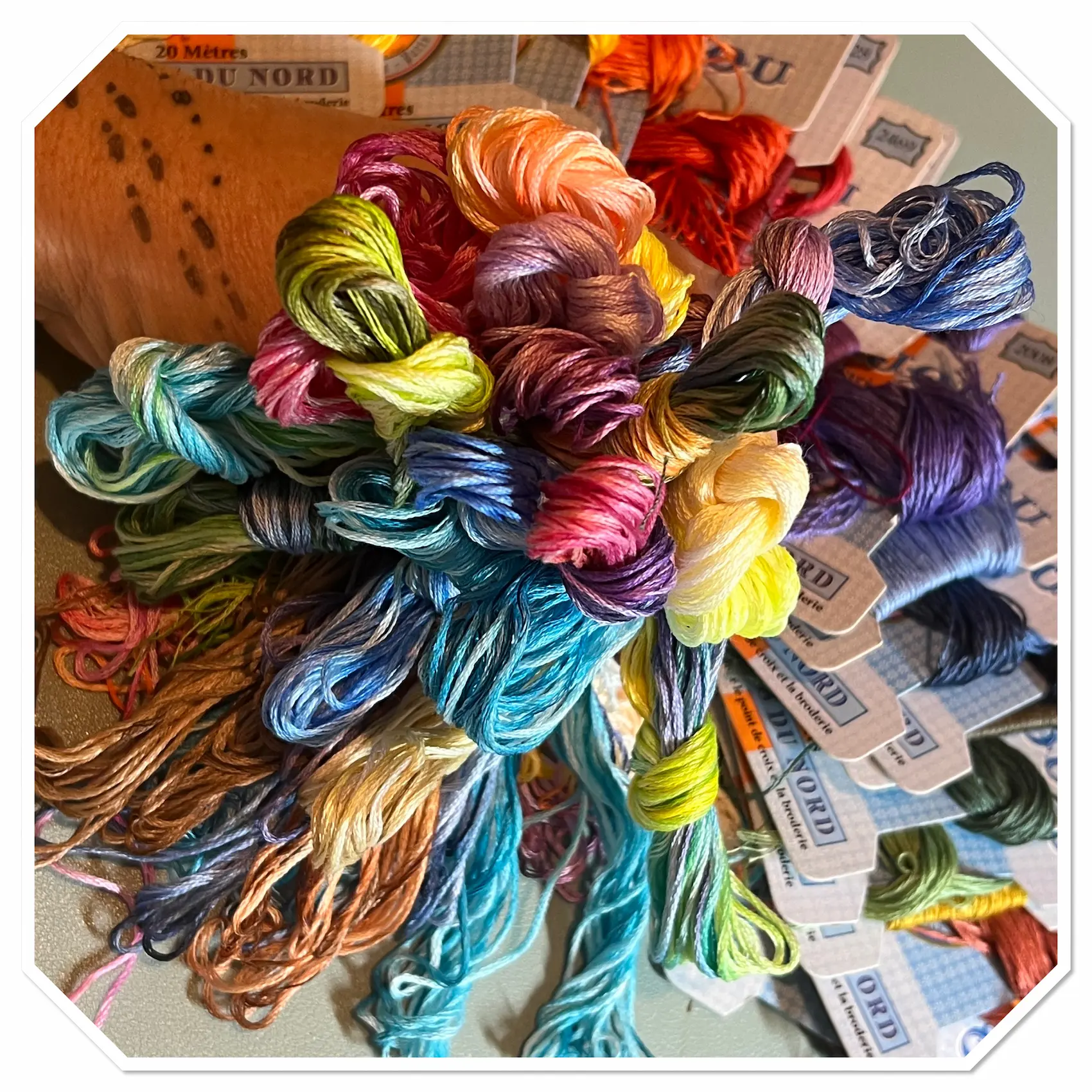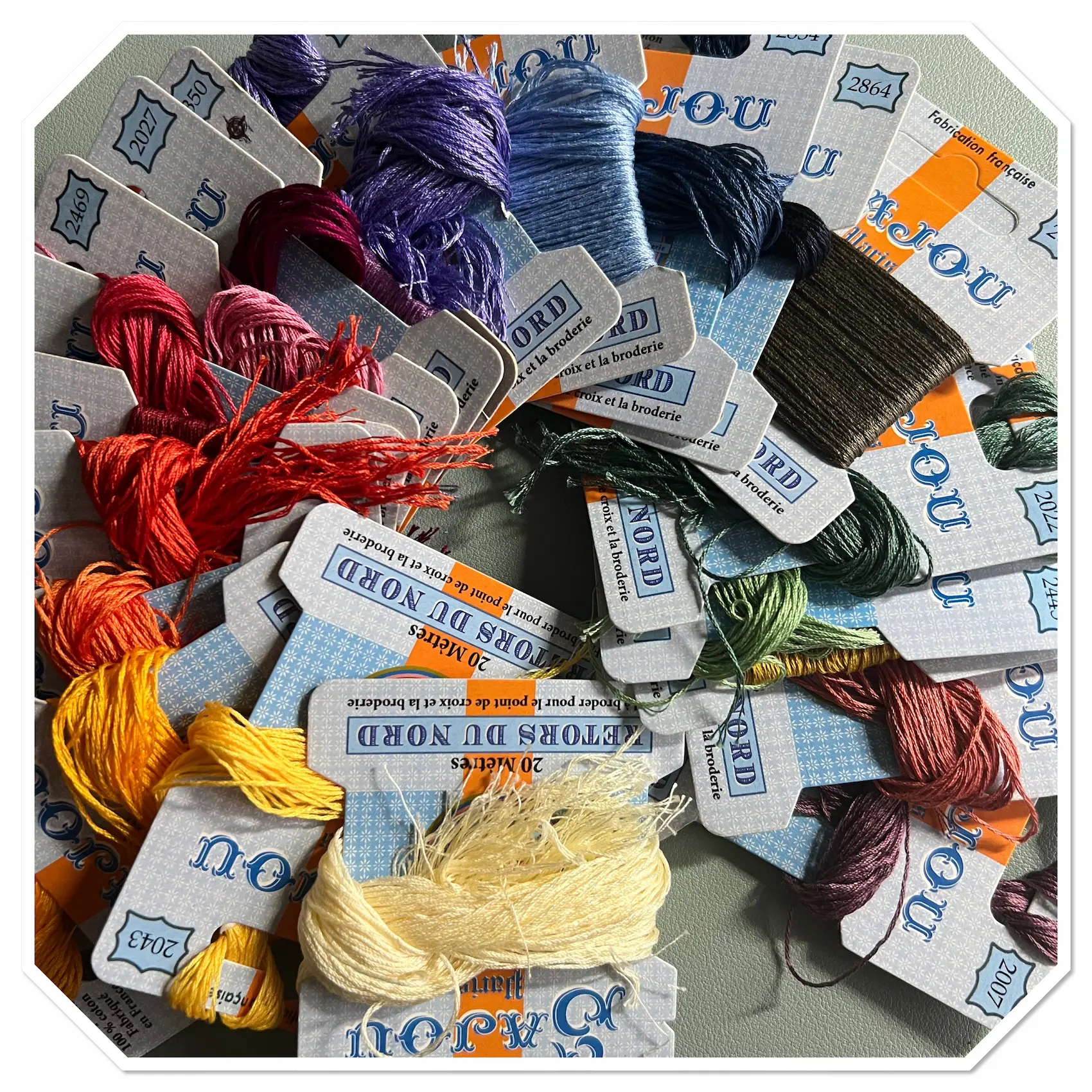 Fils SAJOU : les deux grilles avec la quantité de fils Sajou nécessaire pour chaque zone, 20 couleurs différentes également + les embellissements + une petite surprise