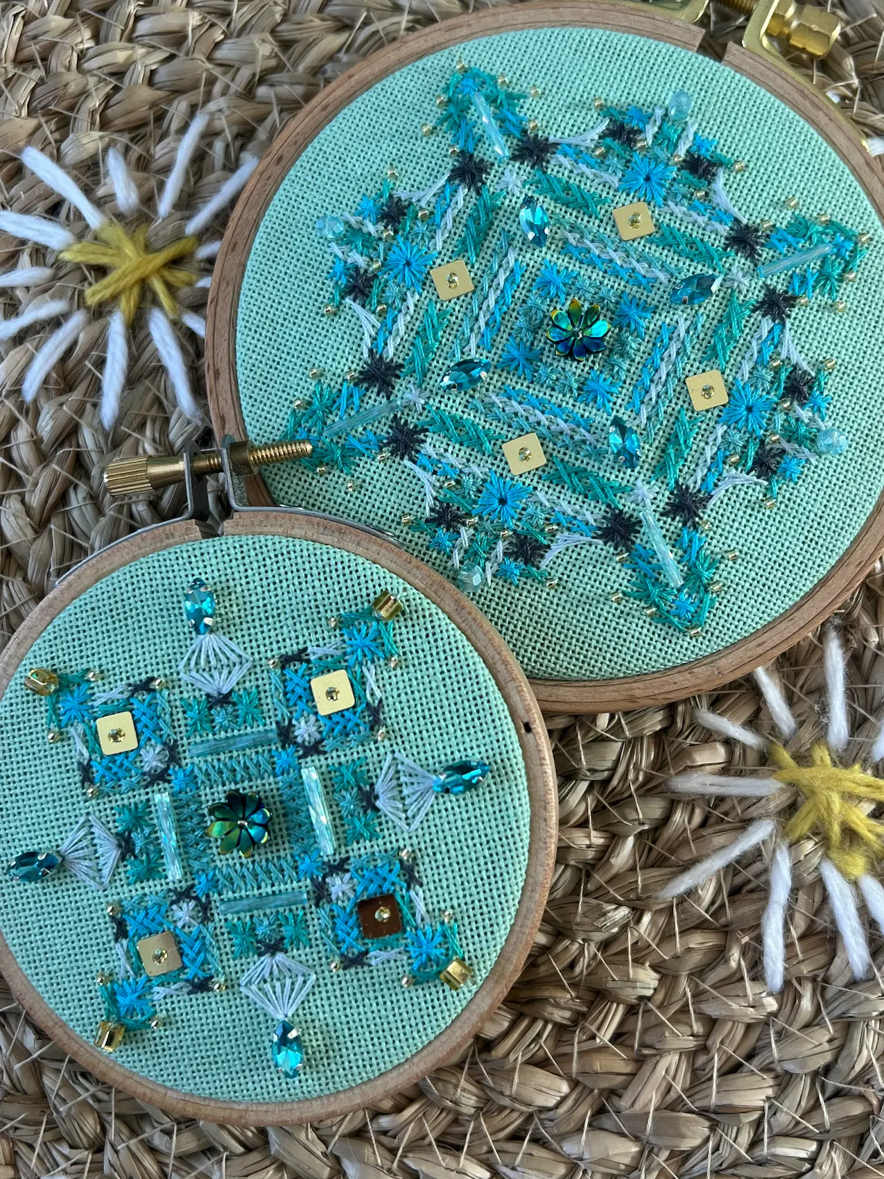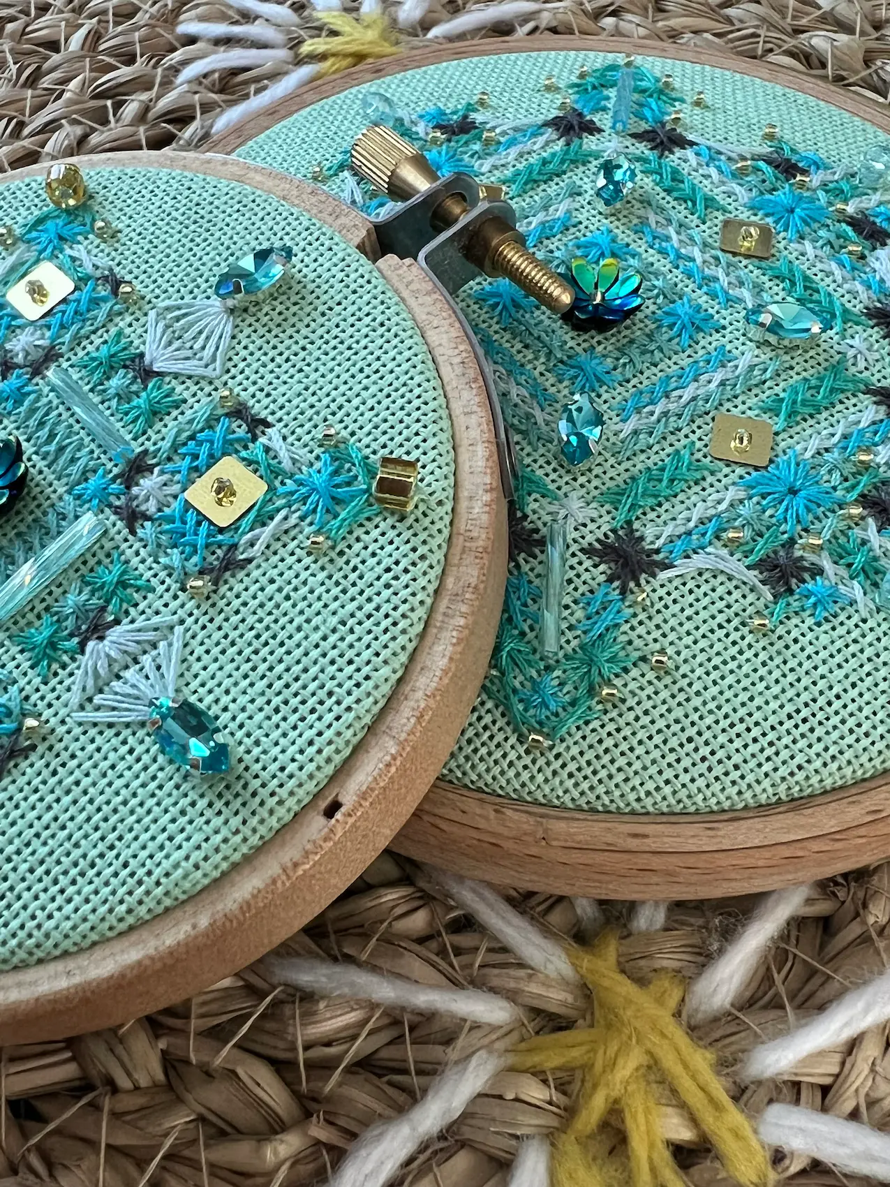 la pochette comprend les deux modèles, ainsi que les embellissements qui subliment ces petites broderies, cristaux, rocailles, paillettes